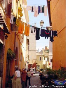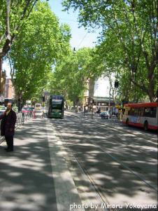 | トラステヴェレ通りを走る路面電車。 街路樹のプラタナスが眩しい。 |