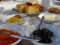 マンマオリジナルの手作りフルーツジャムとケーキ、カプチーノの朝食