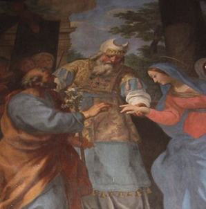 祭壇中央のキリストの両親であるジュセッペとマリアの婚姻を祝う。名画が永遠の幸福を祝福します。