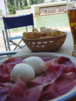 モッツアレッラチーズとたっぷりの生ハム、パンで8ユーロでした。