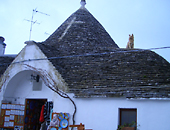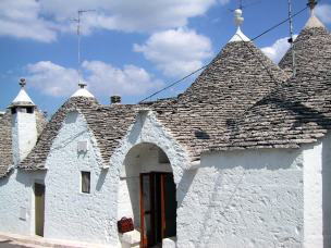 トゥルッリのその殆どが現在もなお住居として使われている。駅から来ると、 モンティ地区の手間の広場を左に曲がった所になる。外にイスを出し腰掛けて、話す住人達が、 「中に入って見てみていいよ」と気軽に声をかけてくれる。見せてもらったお家の梁は、昔ながらのオリジナルで、 小さなロフトがその上にあった。昔ながらのものを残して保存していくのはどこの国も同じだが、高くつくらしい。