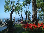![]() Ravelloの町をすこし、散歩してみよう。Dumo左横のインフォメーションの先に、のぼりの階段が続いている。せっかくだから、登ってみると小さな広場に出る。左にてこてこ歩くと、まもなく、「Palumbo」の看板が見えてくる。こんな小さな町、Ravelloには実は5つ星のホテルが二つあり、ひとつはここパルンボ、そしてこの女王ピエモンテの見晴台をはさんでもう一つは隣の、パァッツォサッソ。と言うことで、この見晴台は5つ星ホテルに挟まれた、紛れもない5つ星の眺めを持つ見晴らし台。1953年には”Il
