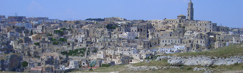 ★車で町を出て、Laterza、Taranto方面へ。反対側から見るマテラの町。原始時代を思わせる手つかずの洞窟住居が点在する地区へはナポリ発着日帰りツアーで可能(要リクエスト) |