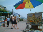 デンゼルワシント、ダスティホフマンなどハリウッド俳優もバカンスにやってきた。もともと漁師町だった小さな入り江では、地元の画家がポジターノの風景を書いていたり、砂浜に続く狭い路地にポップな色のビーチファッションや土産物屋がならぶ。 ★車は途中の広場までしか進入できないためビーチ近くのホテルへは、広場からポーターを呼ぶシステムになっている。 |
