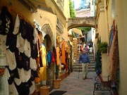 ユネスコの世界遺産に登録されたアマルフィ海岸の中心地。中世初期に海洋貿易港として ベネチア、ジェノバに先駆け発達した町は、貿易港らしくアラブの影響を受けた 歴史的建築物が海のブルーに映えてエキゾチックな雰囲気。 常に観光客を魅了してきた誇り高い海洋都市だ。 西洋で始めて羅針盤を開発し、航海術を大幅に発展させたフラビオジョイアのブロンズ像が町の玄関口にある。マリーナ門をくぐれば、町の中心Dumo広場に到着。このDumo広場を中心におみやげ物、レストランが並ぶメインストリートが始まる。左手をちょっと入ると、敵の侵略を防ぐべく、迷路のようになっている、真っ白な小道が印象的だ。 |
