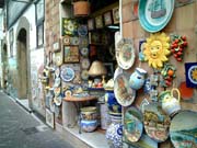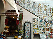時間があったら寄ってみたい場所だ。町の入り口は小さな広場になっていて、広場正面には数件の陶器のお店が軒を並べている。広場から続く町のメーンストリートにも陶器を扱うお店が沢山あり。このビエトリの伝統的な柄はソリメーナ社のマークにもなっている鳥がデザインされたもの。そのほかに動物やレモン、太陽と月など地中海らしい明るいイメージの柄であふれている。 |